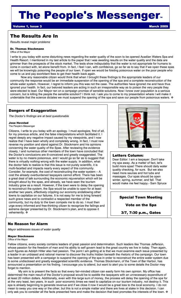 The class culminated in an environmental treatment of Ibsen’s “An Enemy of the People.” The “performance” took place over several weeks. While the students were adapting and rehearsing the final act of Ibsen’s play, they published a weekly “newspaper” complete with editorials, letters to the editor, and graphic advertising that presented the exposition and actually embodied the plot elements of the play. At the live performance, which took the form of the town meeting at the heart of Ibsen’s Act III, students further presented the ecological theme of the play through scientific poster displays, improvisational interplay with audience members, and even hawked homemade cookies as they “sold” their ideas and opinions, attempting to influence the actual vote that the audience would take at the evening’s end.
