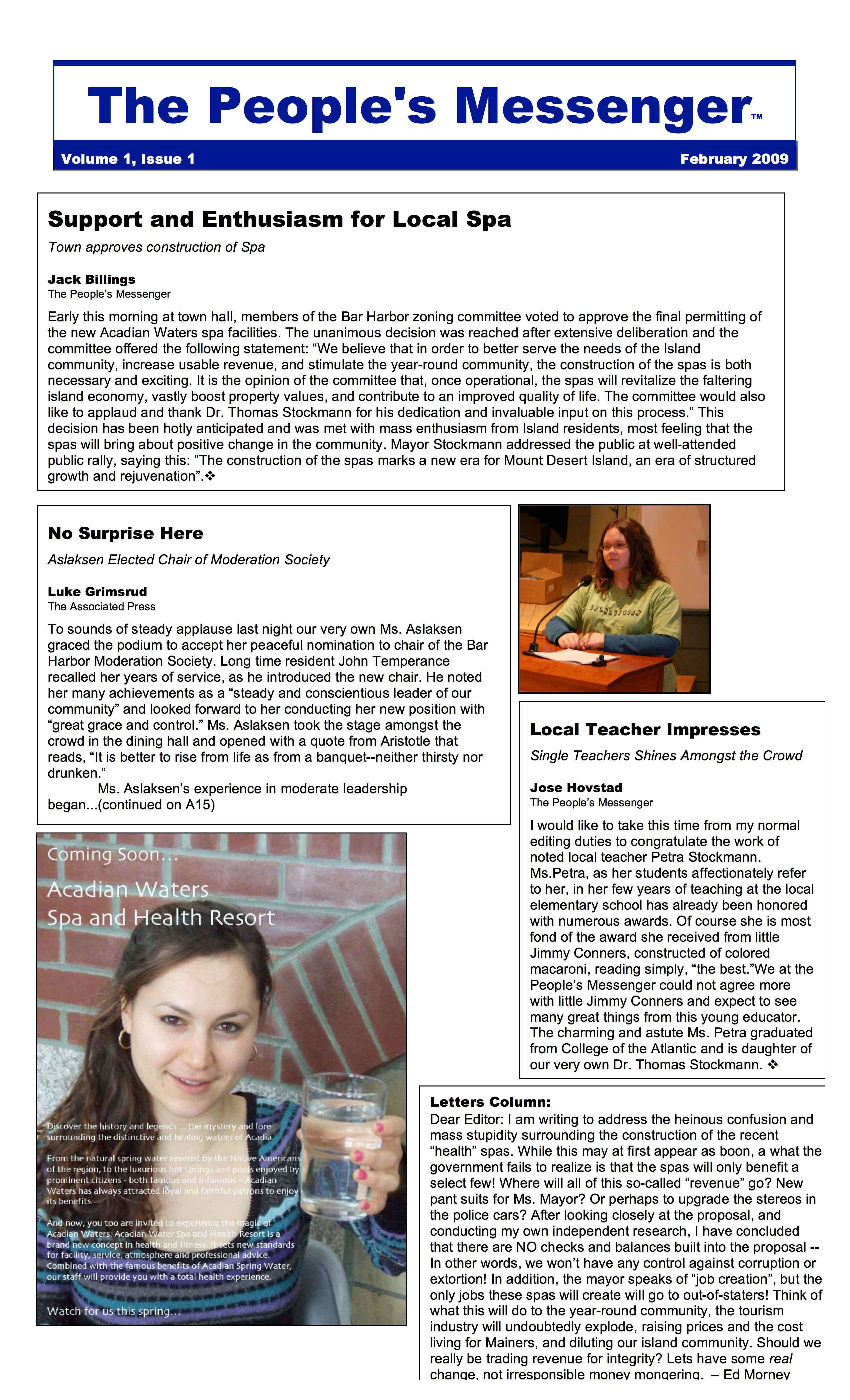 The class culminated in an environmental treatment of Ibsen’s “An Enemy of the People.” The “performance” took place over several weeks. While the students were adapting and rehearsing the final act of Ibsen’s play, they published a weekly “newspaper” complete with editorials, letters to the editor, and graphic advertising that presented the exposition and actually embodied the plot elements of the play. At the live performance, which took the form of the town meeting at the heart of Ibsen’s Act III, students further presented the ecological theme of the play through scientific poster displays, improvisational interplay with audience members, and even hawked homemade cookies as they “sold” their ideas and opinions, attempting to influence the actual vote that the audience would take at the evening’s end.